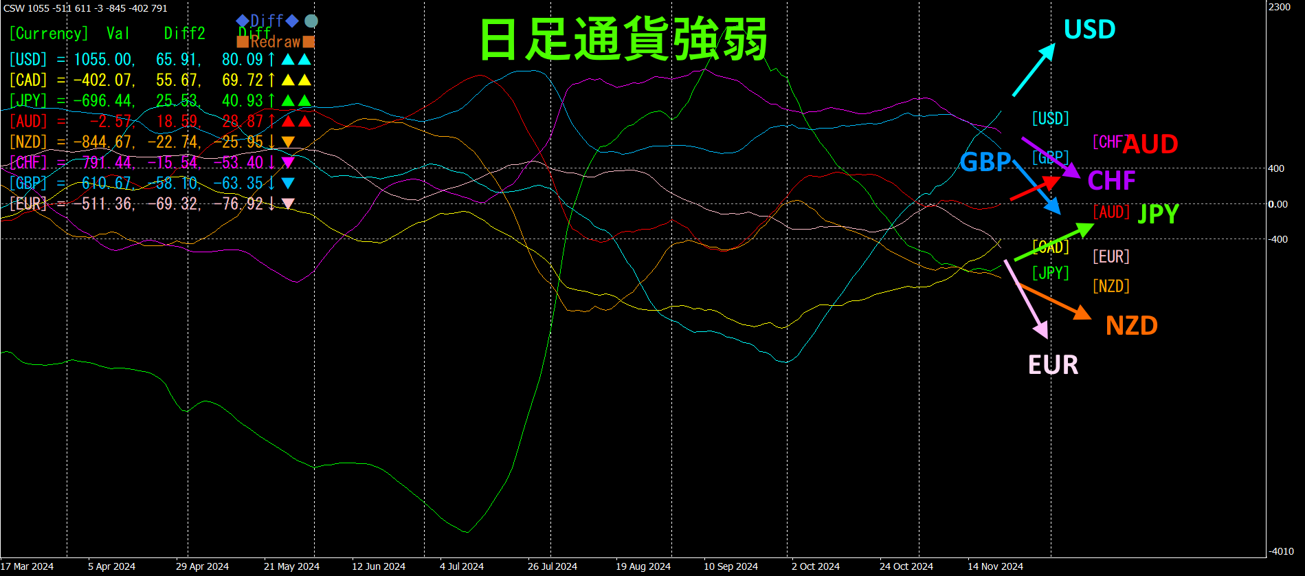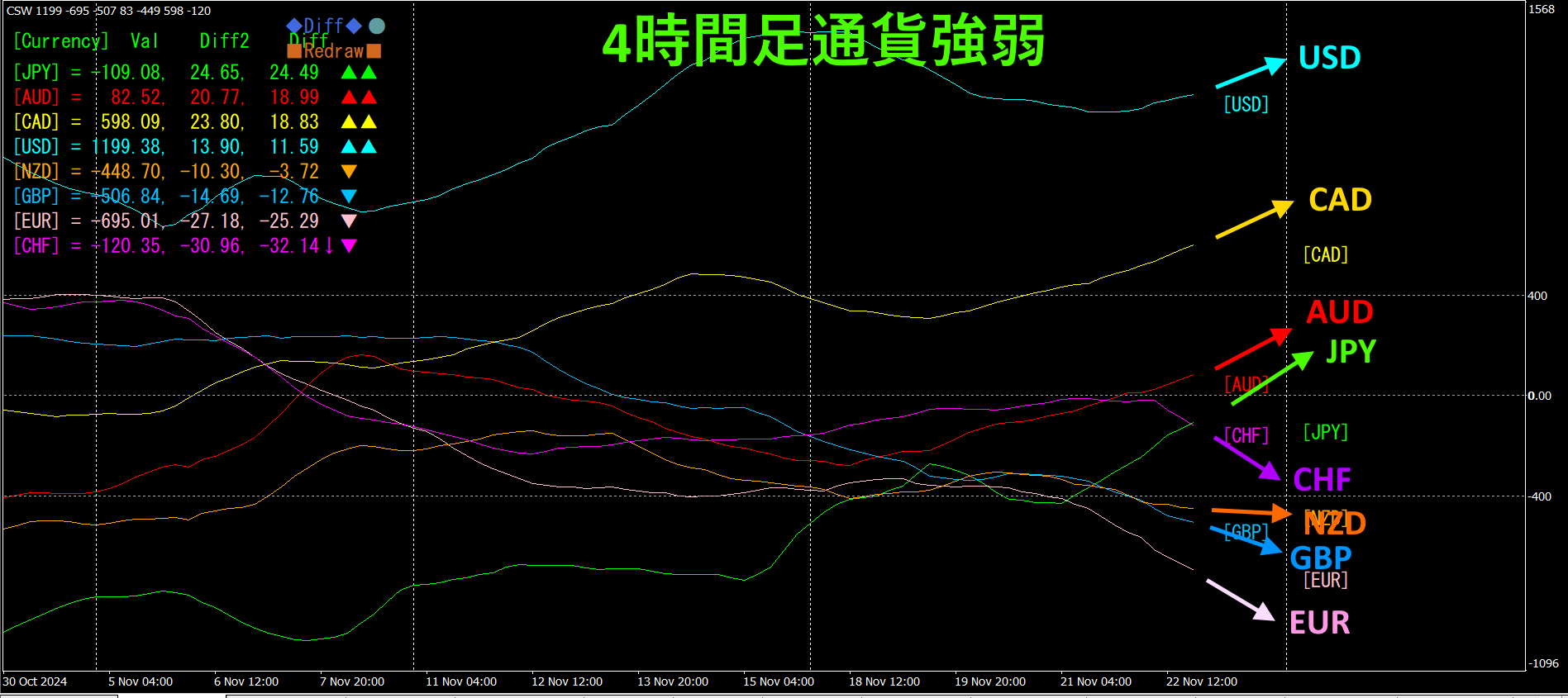 4時間足では、JPY、AUD、CAD、USDが上向き、CHF、EUR、GBP、NZDが下向きになっています。