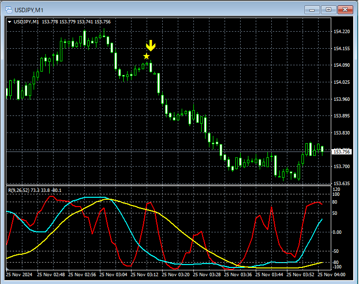 本日のドル円(2024/11/25)仲値トレードにおけるmBDSR(RCI2本フィルター)の戻り売りサイン