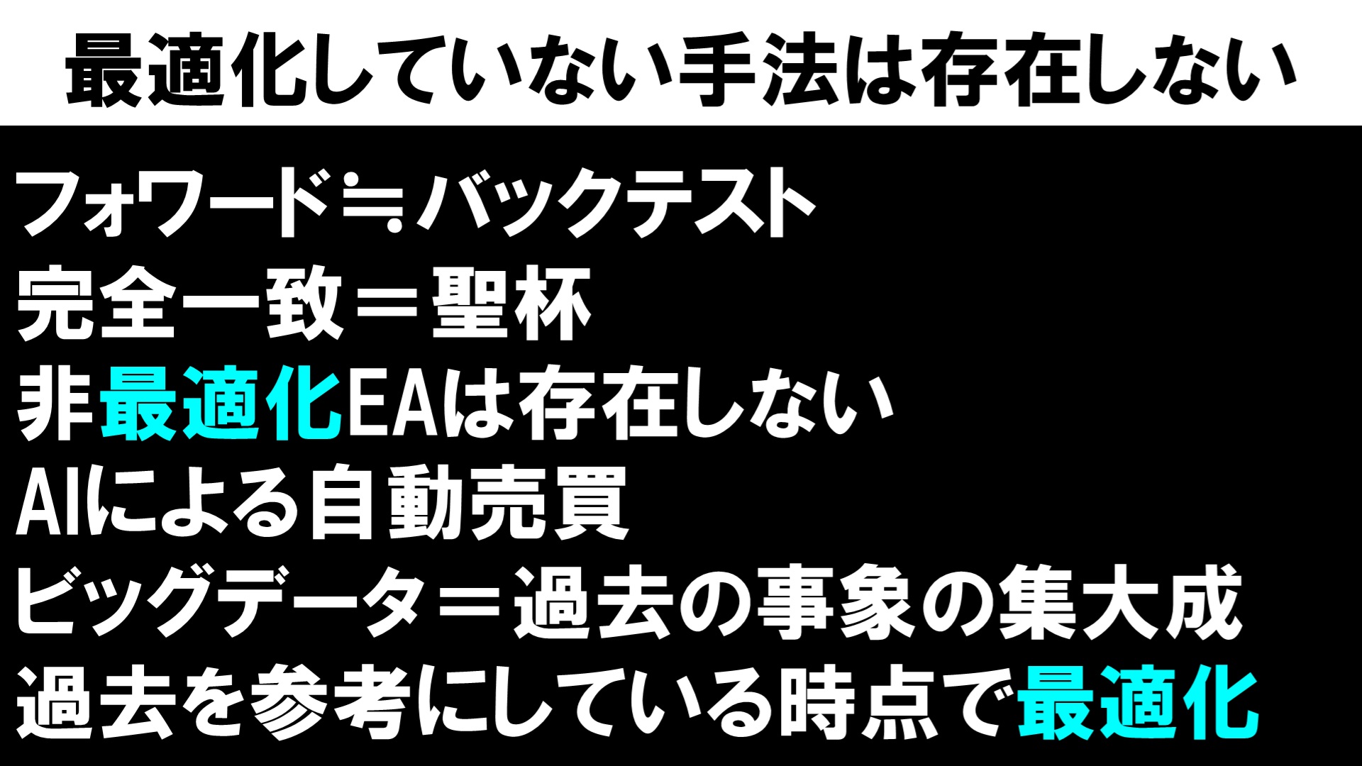 って考えた時点で、過去のデータに合わせて…つまり最適化して手法を開発していることになります。 ということなので、最適化されていないEAも無ければ手法も存在しないんです。