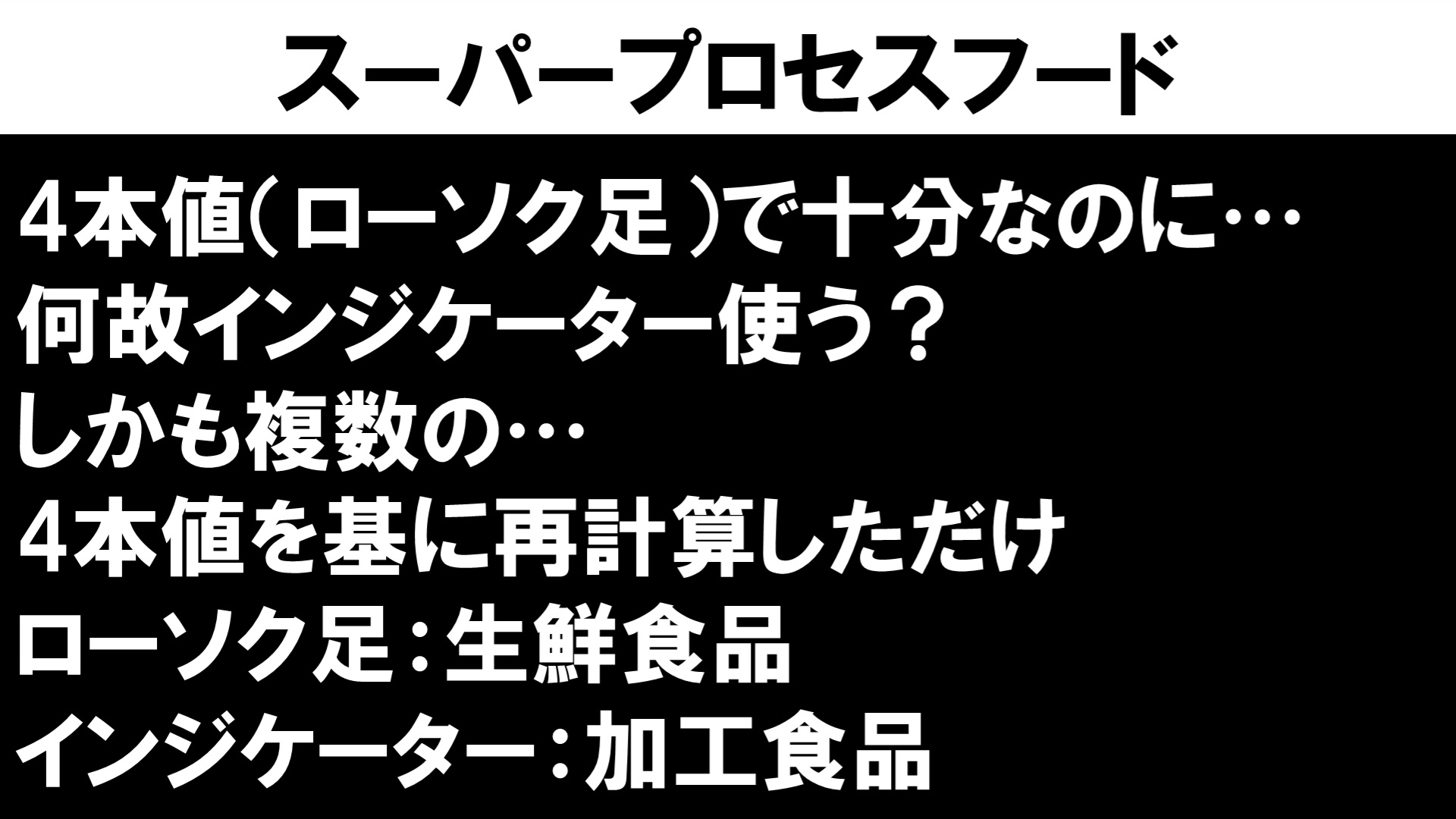 この世に存在するインジケーターの90%以上が4本値を基に再計算した物に過ぎない。 ローソク足は生鮮食品。インジケーターは加工食品。