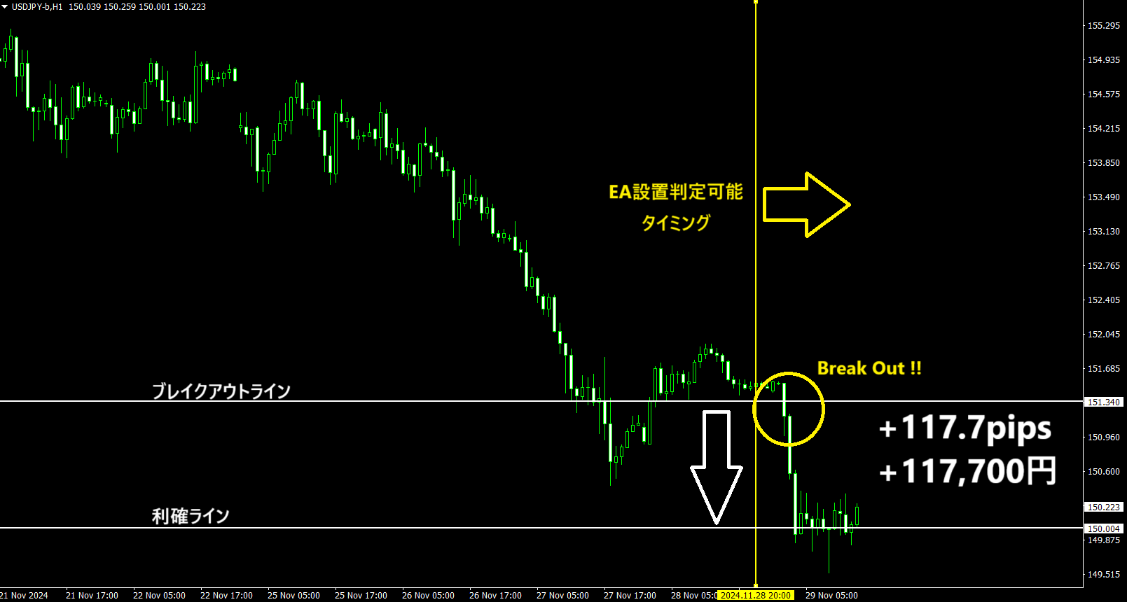 ④11/29 01:00(日本時間08:00)ブレイクアウト発生、EAにより自動エントリー