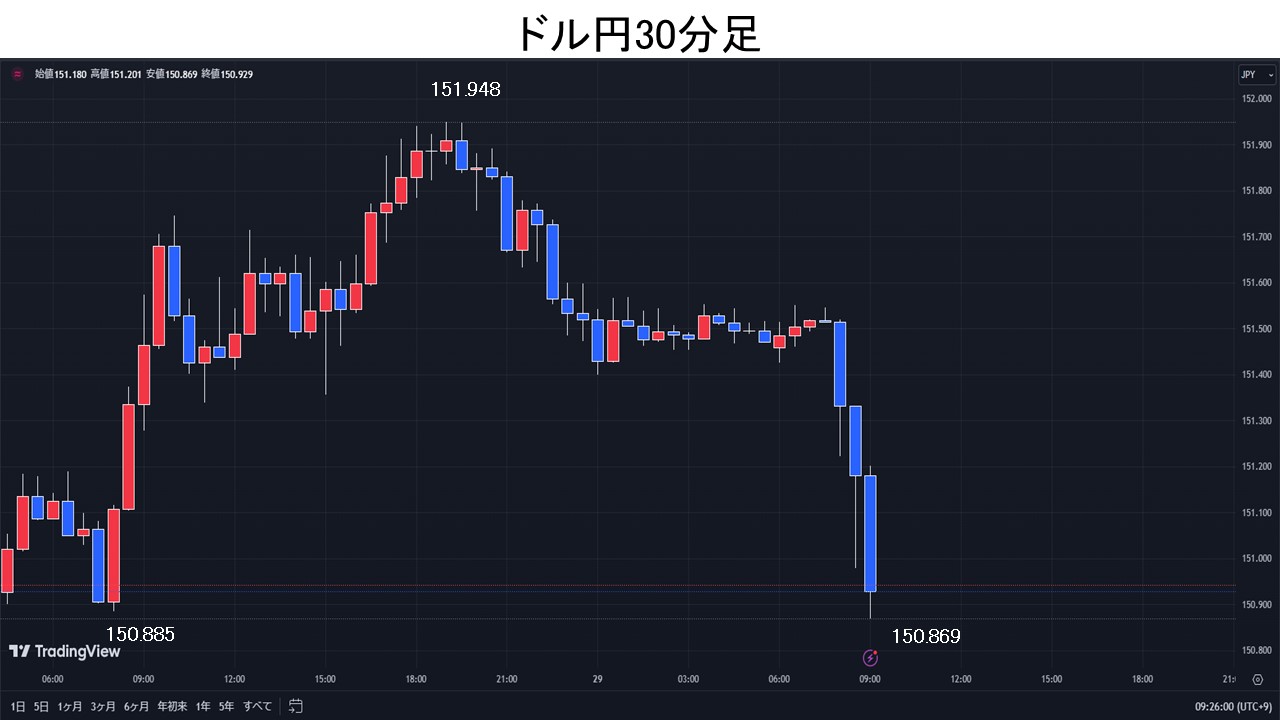 東京時間、トランプ次期大統領とシャインバウム・メキシコ大統領が会談し、「メキシコ大統領はメキシコを経由しての米国への移民を止めることに同意し、事実上、南国境を閉鎖した」とのSNS記事を受け、メキシコペソ円が上昇。ドル円はつれる形で151.75円まで上昇となるが、その後は151円台半ばで小動き。欧州時間、「米政権の検討している追加の対中半導体規制が以前想定されていたより厳しい措置には至らない見通し」との報道を受け、リスク・オンの円売り・ドル買いが先行。ドル円は一時151.94円まで上昇。NY時間は米感謝祭で休場となる中、ドル円は151円台半ばで膠着。