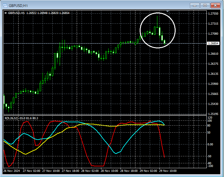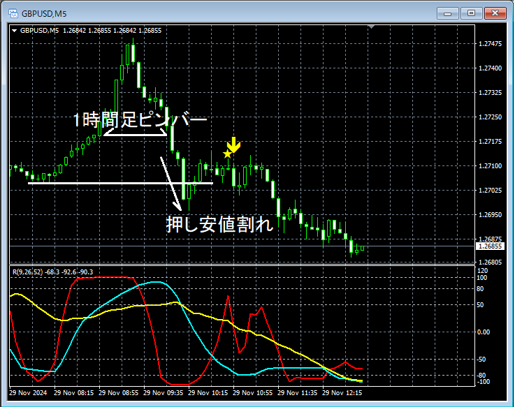 【本日2024/11/29のポンドドル】上位足におけるピンバーと下位足における押し安値とmBDSRの戻り売りサイン