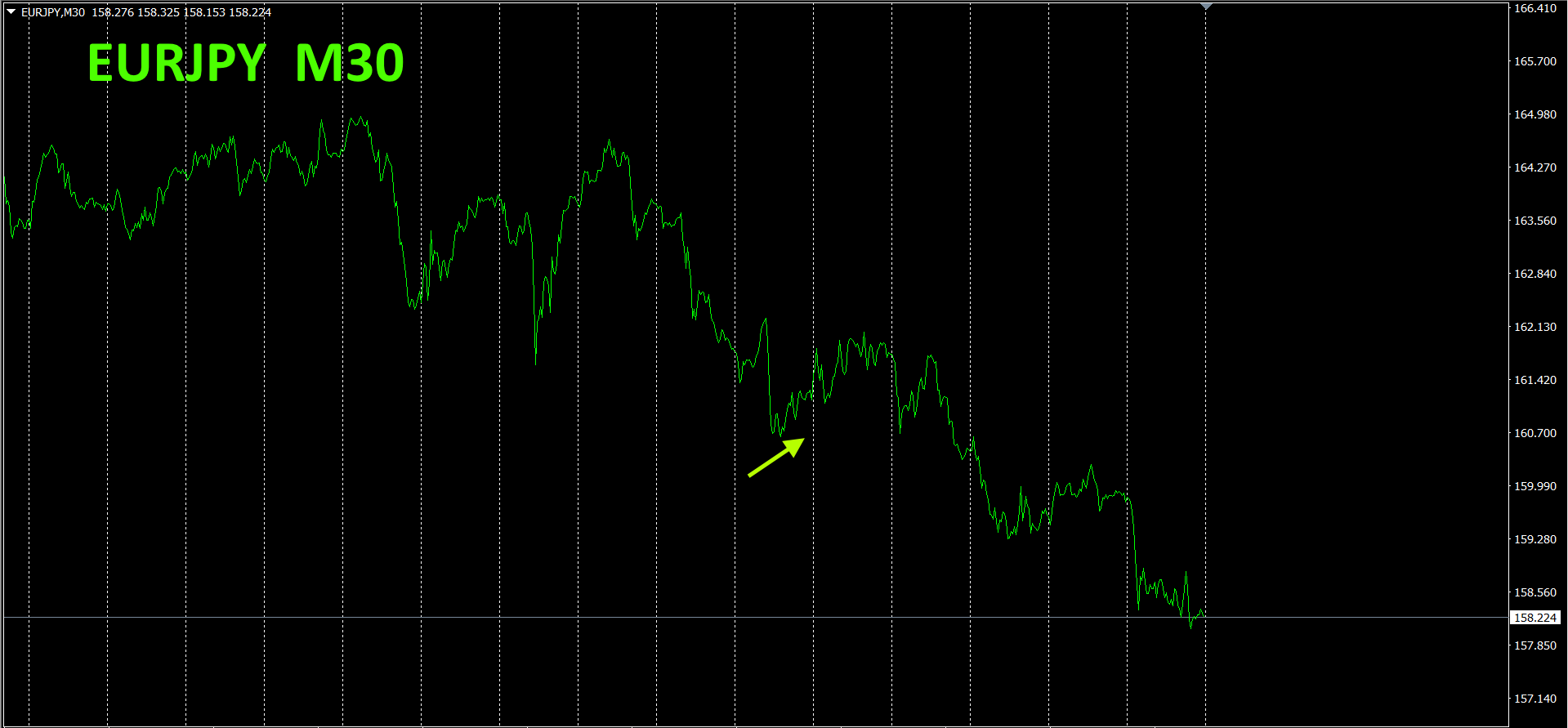通貨強弱チャートで最も弱い通貨だったEURが上方向に、最も強かったJPYが下方向に向いてきました。通貨強弱チャートのベクトルを見れば、今後は、EURJPYが上昇することが分かります。