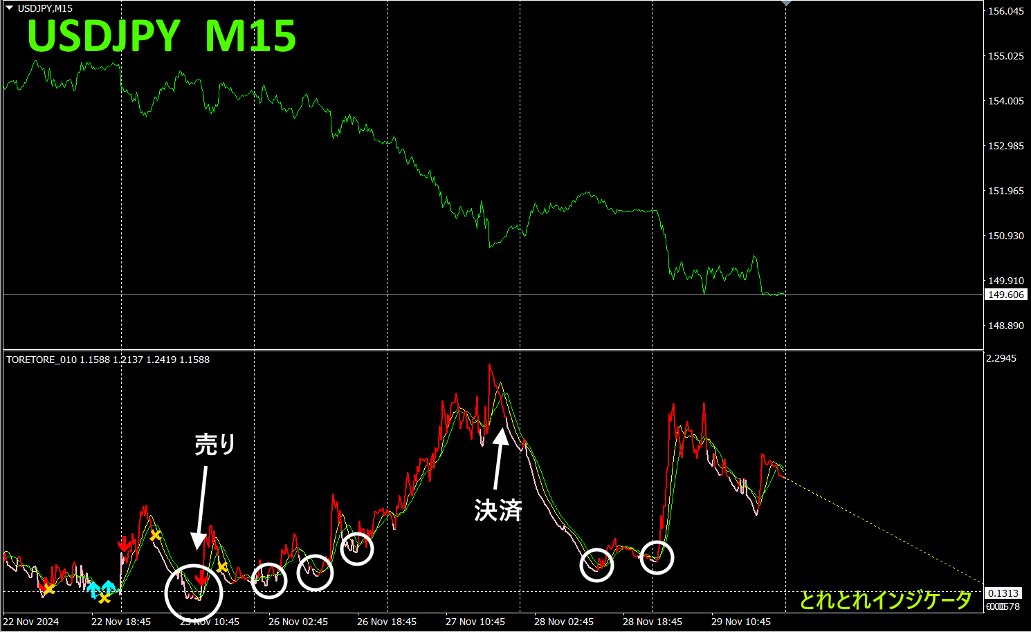 「とれとれインジケータ」は、様々な所で活用できる汎用インジケータになっています。以下は、「とれとれインジケータ」の適用事例です。通貨ペアはUSDJPYでチャートは15分足です。