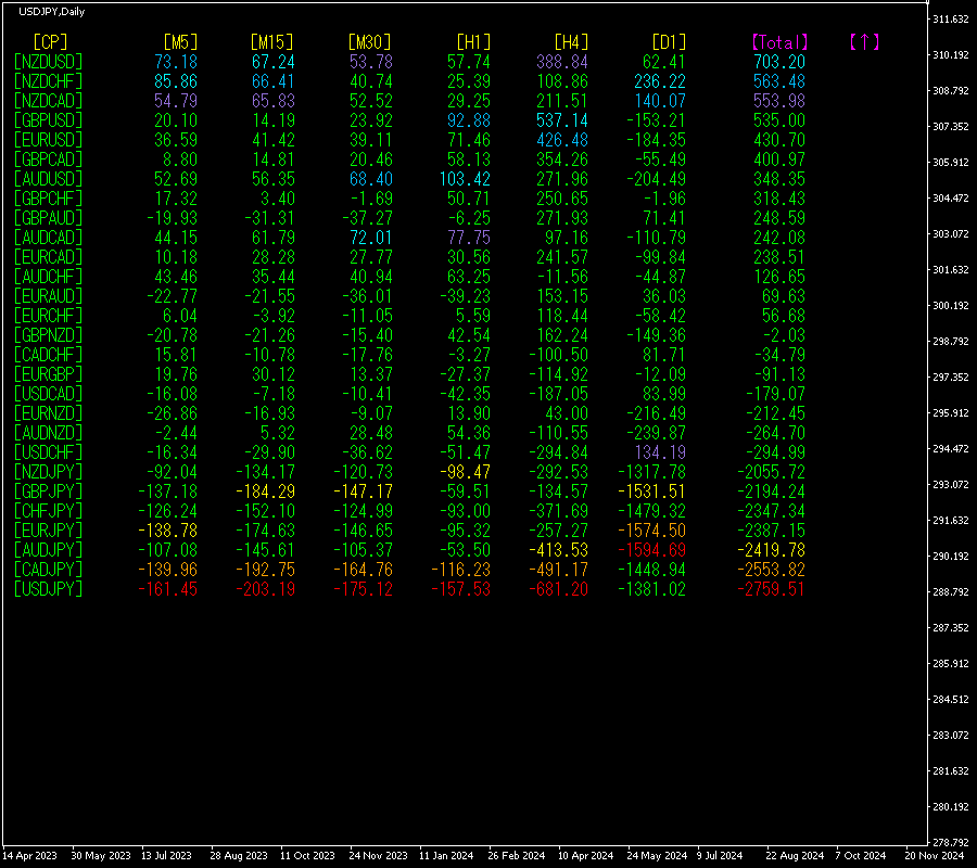 [Total]数値の降順に並んでいます。一番下にあるUSDJPYは、日足を除いた全ての時間足で赤色表示になっています。Total数値が2759.51と、大きなマイナスの数字になっています。USDJPYに下降トレンドが発生していることを示しています。