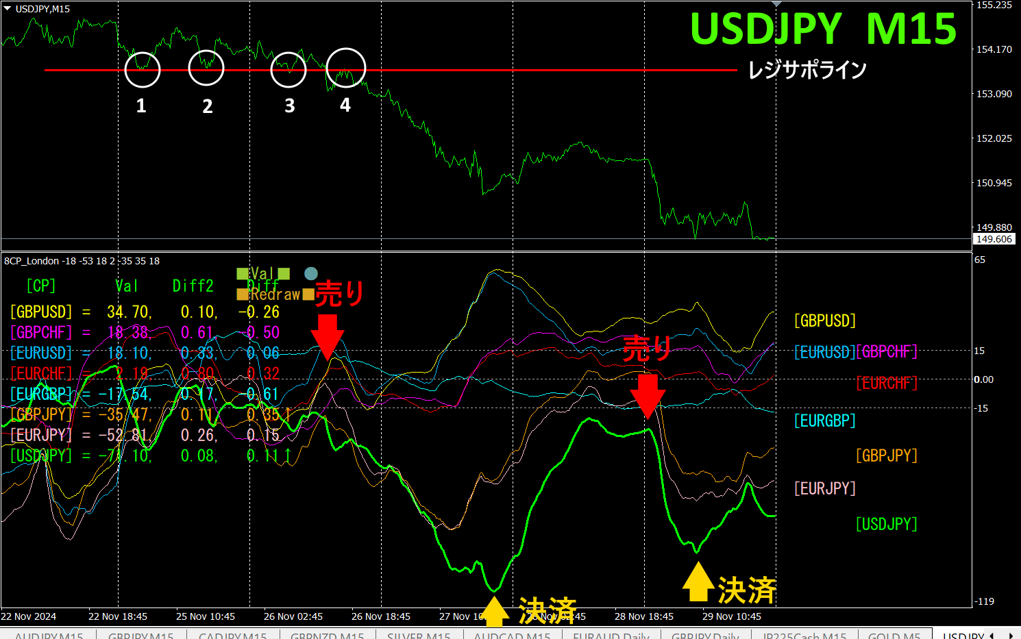 上半分は、USDJPYの15分足チャートです。下半分は、「8CP見える化インジータ」によるものです、緑色太線のグラフがUSDJPYに相当します。