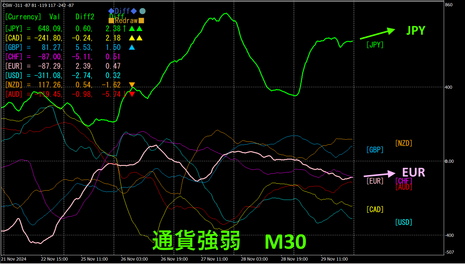 ピンク色がEUR、緑色がJPYです。現在、最も強い通貨がJPYになっていて、JPY>EURの傾向は変わりません。矢印の方向も、JPYの方がEURよりも上を向いています。従って、今後も、EURJPYの下落傾向が継続すると考えられます。