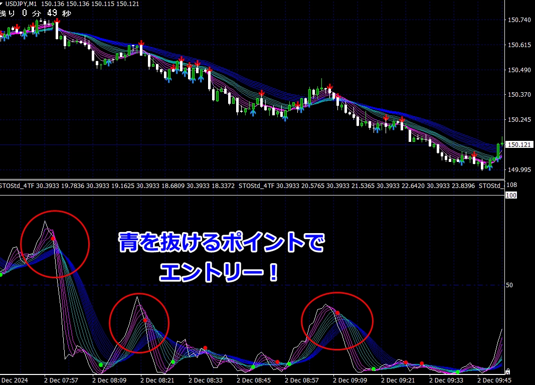 ② 矢印サイン点灯状態で、インジケーターのピンク色の帯が、緑の帯を下からすくい上げるような形状であれば、現在のローソク足が確定する数秒前か確定の直後に1分判定または3分判定でハイエントリーします。