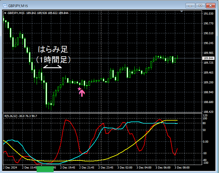 上の1時間足で白い円で囲ったあたりを見るとトレンド転換の可能性を示唆するはらみ足が出現していることが分かる。下位足で押し目買いを考えてもおかしくない場面かもしれない。