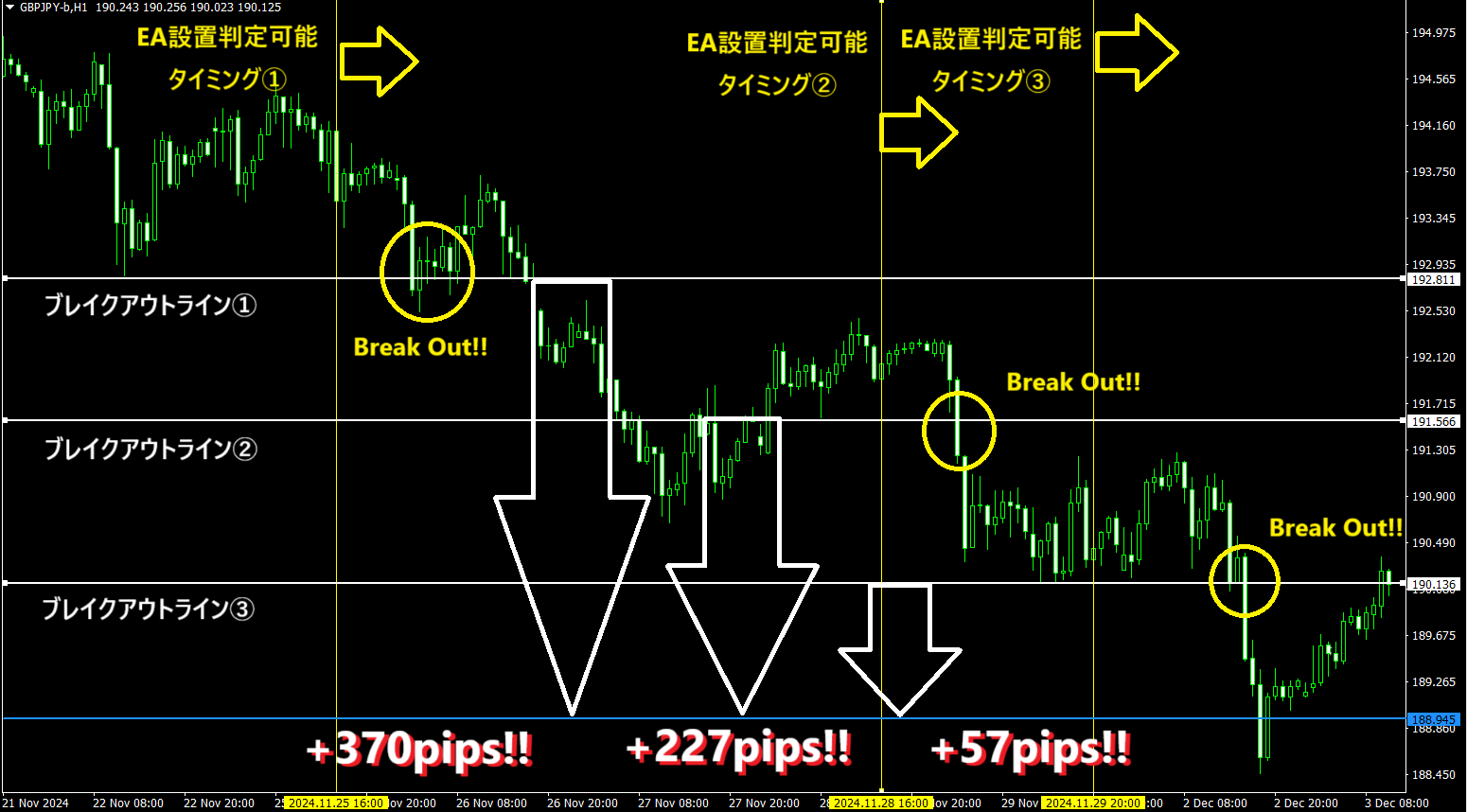⑥12/02 16:00(日本時間23:00) ブレイクアウト発生、EAにより自動エントリー。