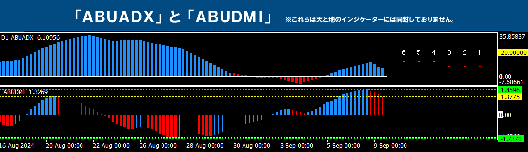 ※ABUADXはTimeFrame機能を使用し日足の設定になっております。従って日足が確定する間は変化します。例えばローソク足4本目まで上昇の流れだったのに5本目に急落してしまうと過去4本も上昇の形に変化する事になります。しかし急騰急落などがない限り、ABUADXの形状の流れは保たれるので非常に効果的です。