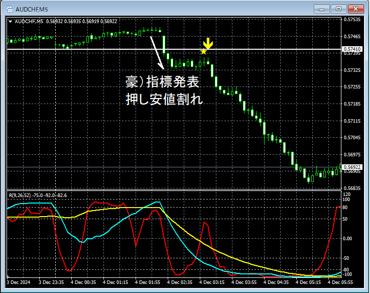 【本日 2024.12.04 のAUDCHF】豪)指標発表と押し安値下抜けとmBDSR(RCI2本フィルター)の戻り売りサイン