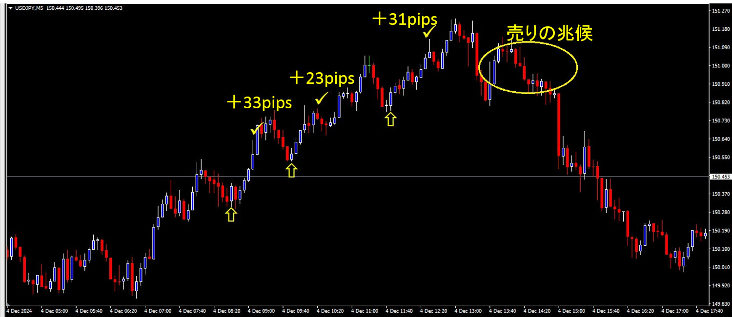上昇後、買い目線が一旦落ち着き、今度は売りの兆候が出ていますので、この辺りから売り目線に切り替えます。
