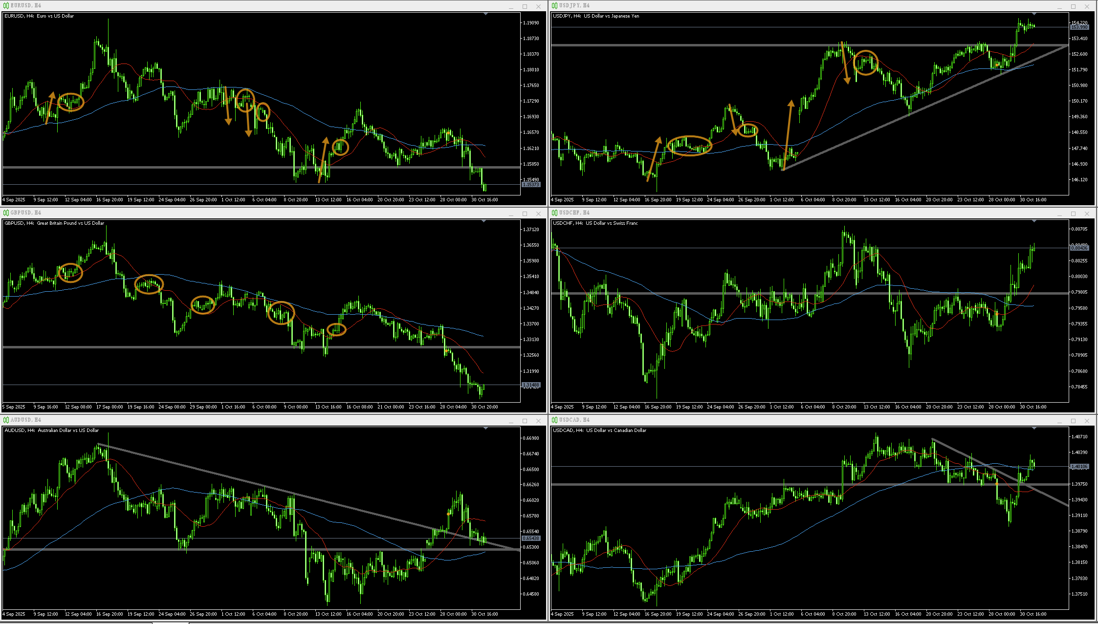 環境認識で4hをシンプルに見ている流れについてご紹介します。まずは4hで並べたチャートを見ます。何に注目しているかというと、