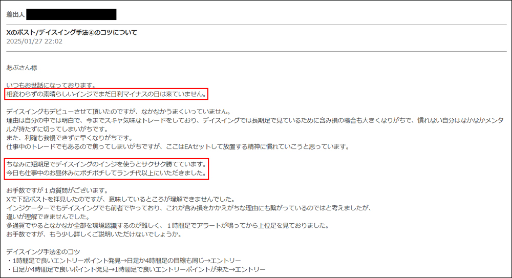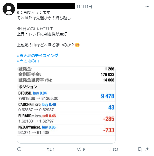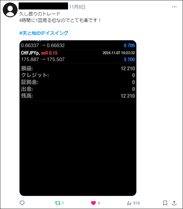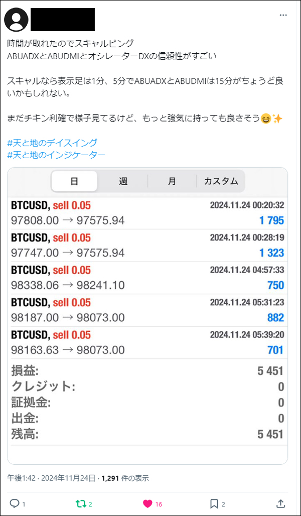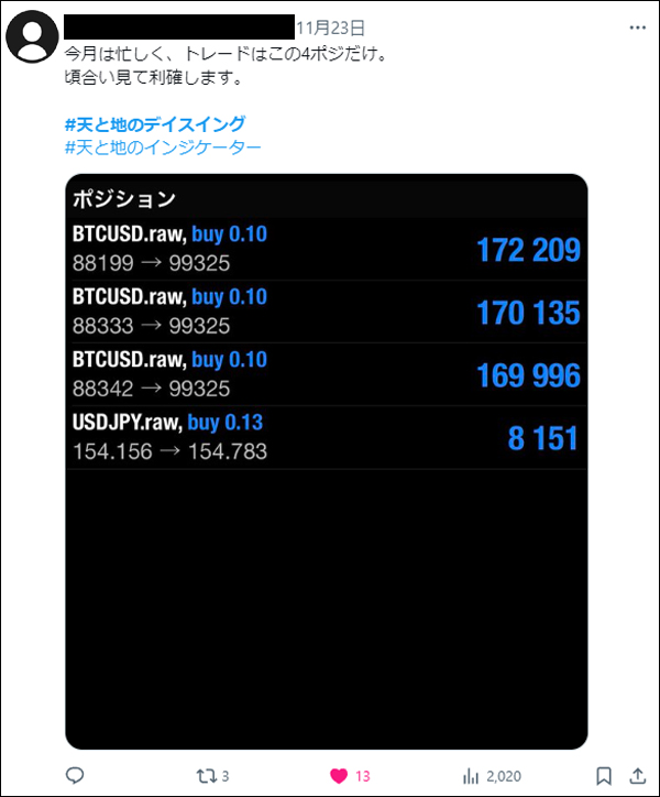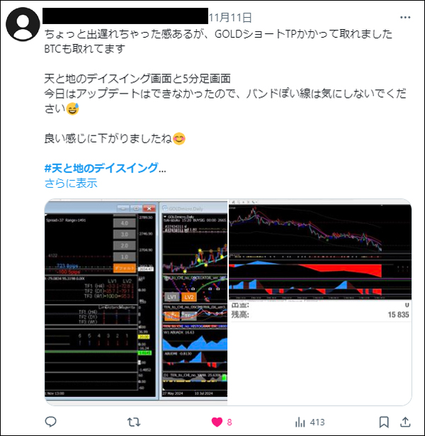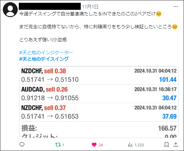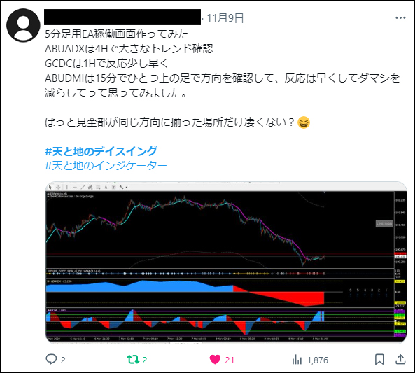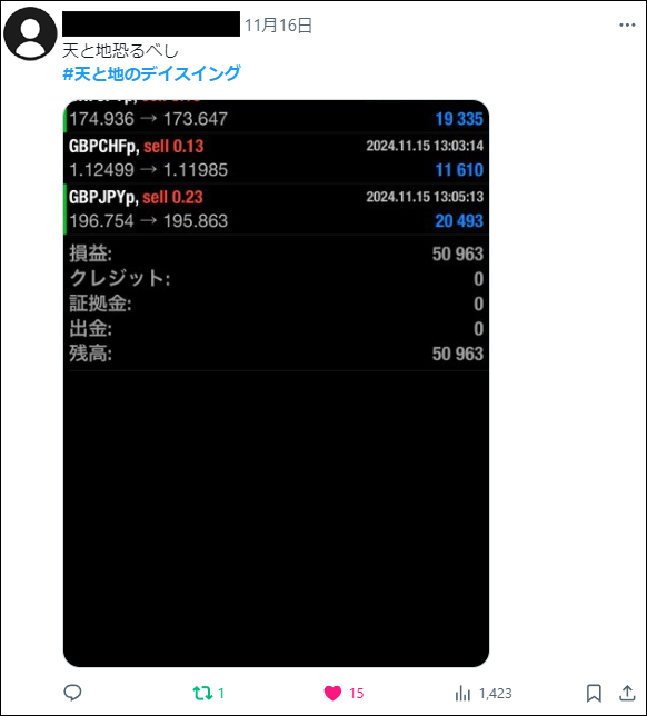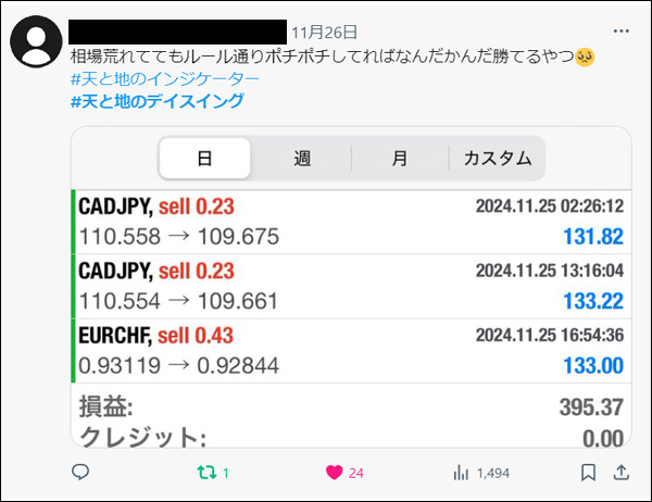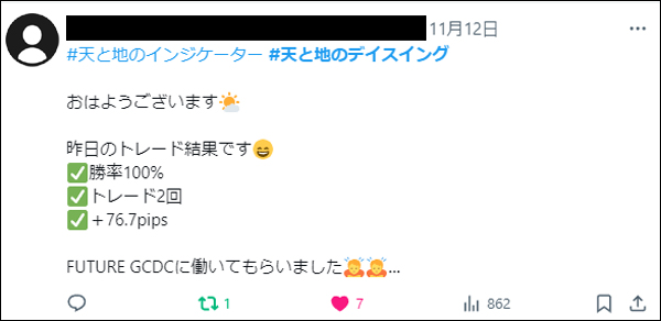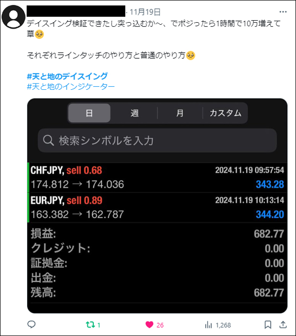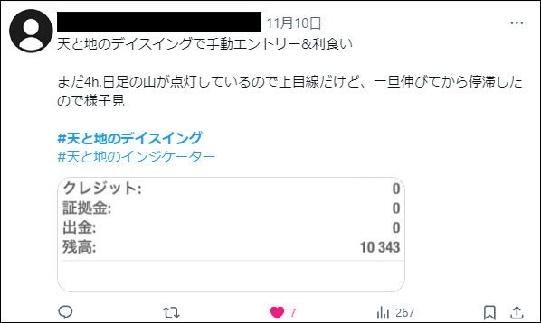 「天と地のデイスイング」をリリース後、たくさんの方々にご利用いただき本当に感謝しかございません。ご利用者は天と地のインジケーターに慣れ親しんだ方々ばかりでしたので、皆さん非常に飲み込みが早く、すぐに使いこなしていたという印象でした。*(旧Twi****)やゴゴジャンのDMなどで成果をご報告いただいてくれましたので、今回選りすぐりをご紹介させていただきます。天と地のデイスイングのご参考になりましたら幸いでございます。(天と地のデイスイングの詳細についてはコチラをご参照ください)