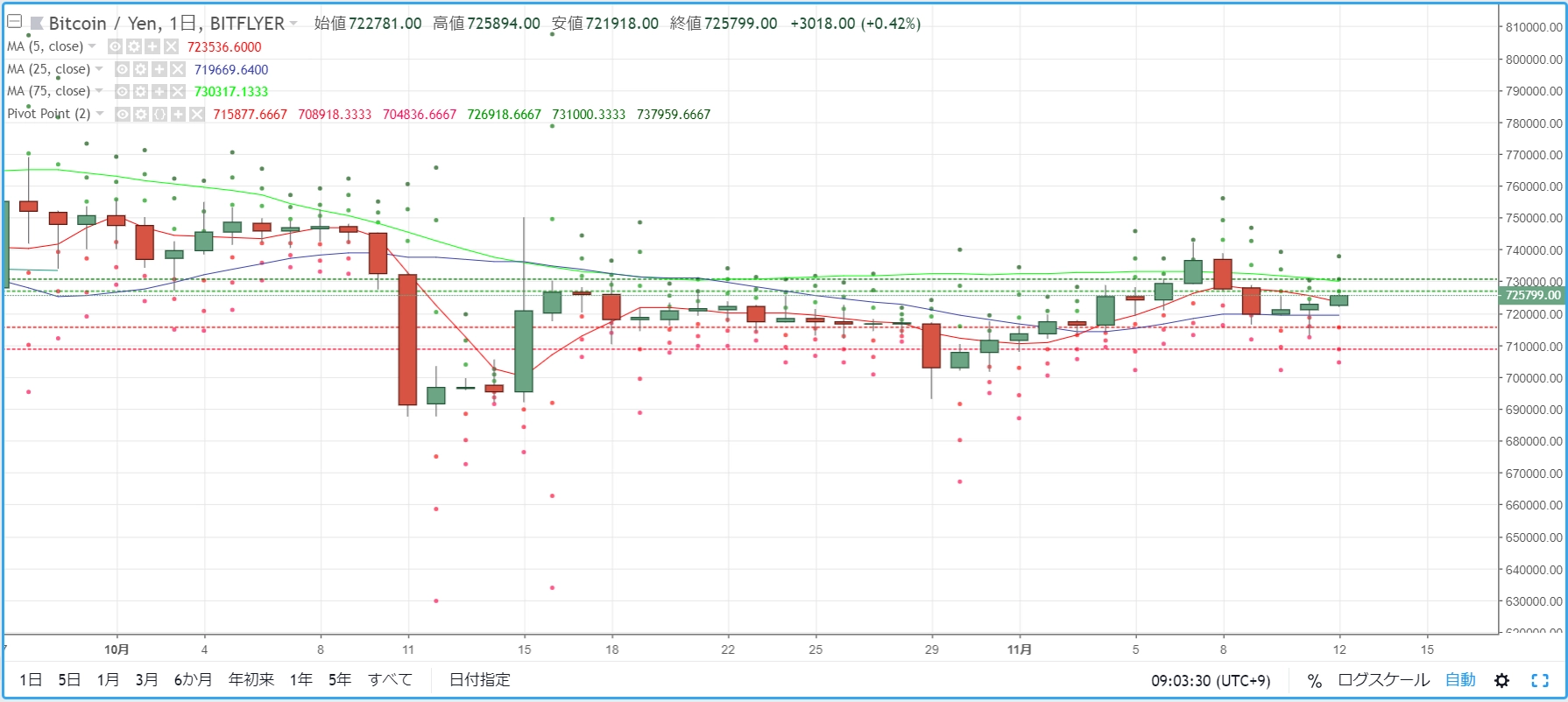画像は2018年11月13日のキャプチャ。ほとんどの銘柄が「赤」となった昨日に引き続き、今日も「赤」が目立っています。ただ、わずかな下落でとどまっているので、これから「緑」に好転する可能性は十分にあります。そんな中、リップルは3%の上昇と、一人気を吐いています。