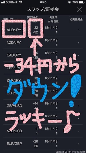 −34円から−32円に。売り口座の支払いが減るということは、日当アップですからこれは嬉しいです。1日あたりの利益が120円増えました。