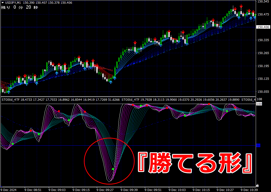 ② 矢印サイン点灯状態で、インジケーターのピンク色の帯が、緑の帯を下からすくい上げるような形状であれば、現在のローソク足が確定する数秒前か確定の直後に1分判定または3分判定でハイエントリーします。