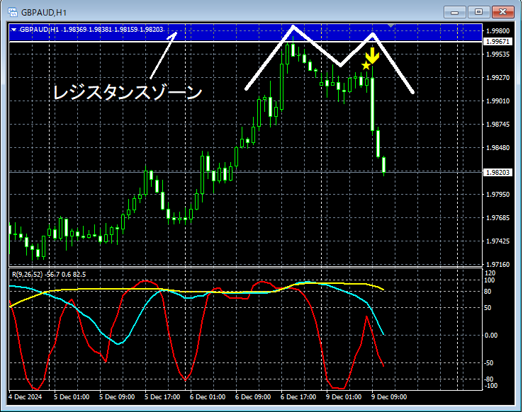 【本日 2024.12.09 のポンドオージー】レジスタンスゾーンとダブルトップとmBDSR(RCI2本フィルター)の戻り売りサイン
