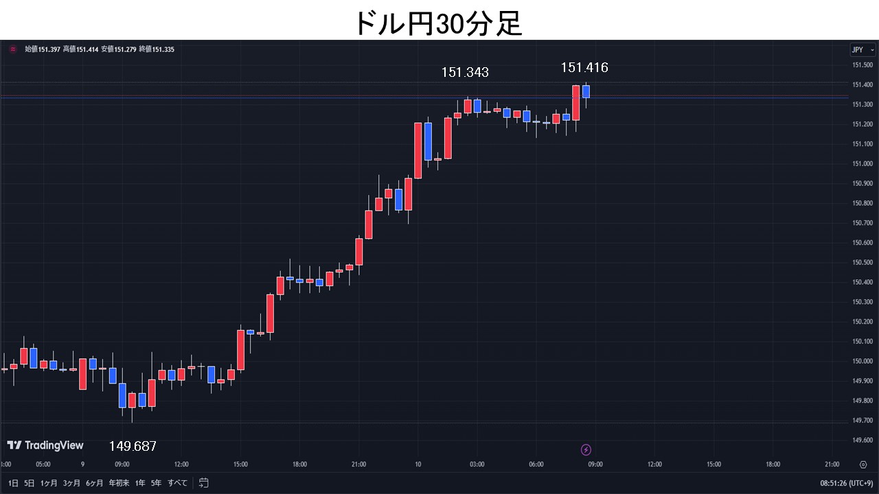 中国景気浮揚期待によるリスク・オンの円売りで、ドル円は151円台へ。