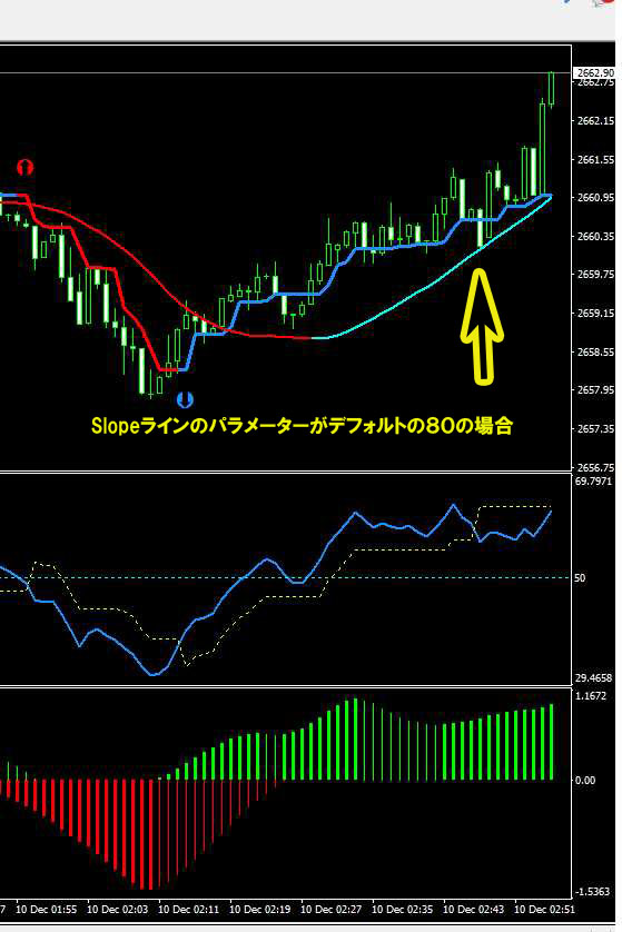 随時売りでエントリーし買いで決済を繰り返しても良いとは思いますが、スプレッド分などを考えると上の画像でも示していますが、最後のSlopeラインの色が青の変わり上昇になったところで利確したほうが面倒じゃないかと思います。