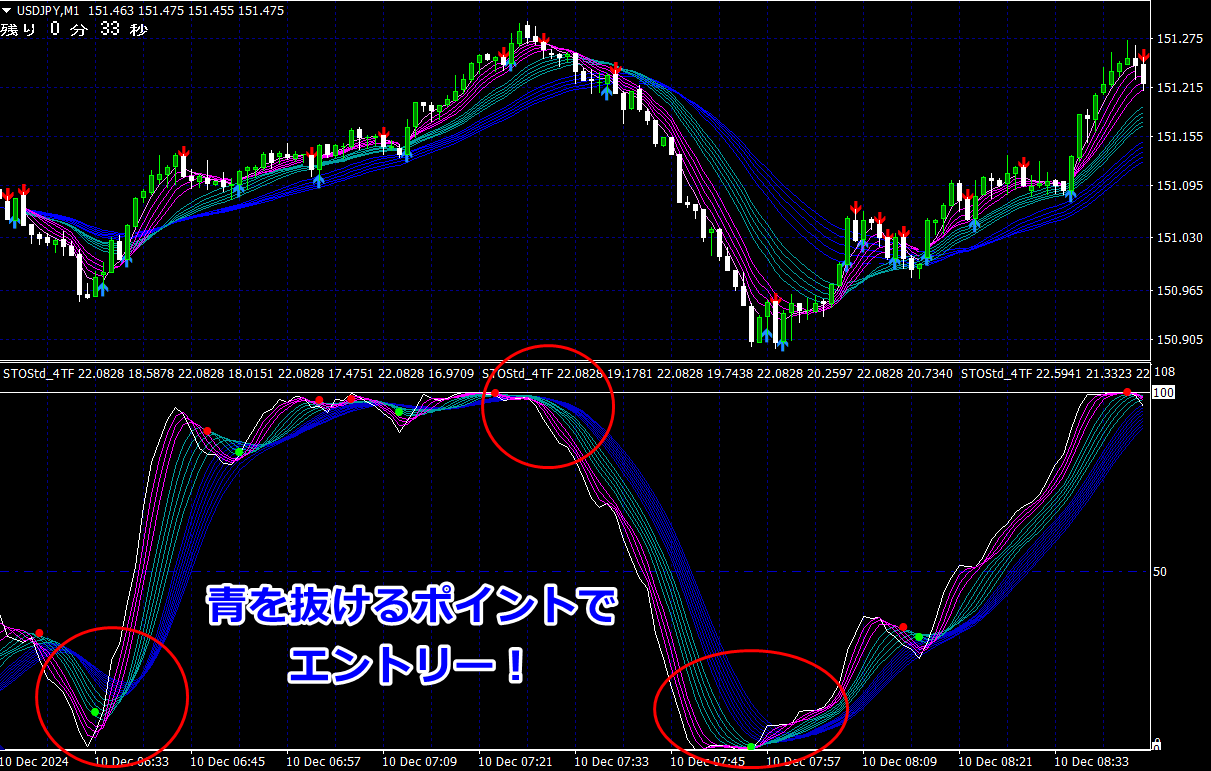 インジケーターの帯はピンク・緑・青の3層構造で、3層の帯は、収斂と拡散を繰り返しますので、 上昇時は、上から ピンク・緑・青 の並びとなり、下落時は、その逆で、上から青・緑・ピンクの並びになります。