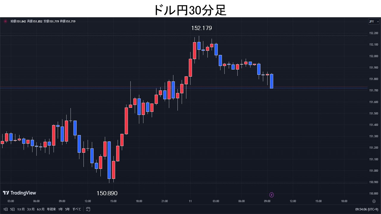 ドル円、米10年債利回り上昇を受け一時152円台まで上昇。