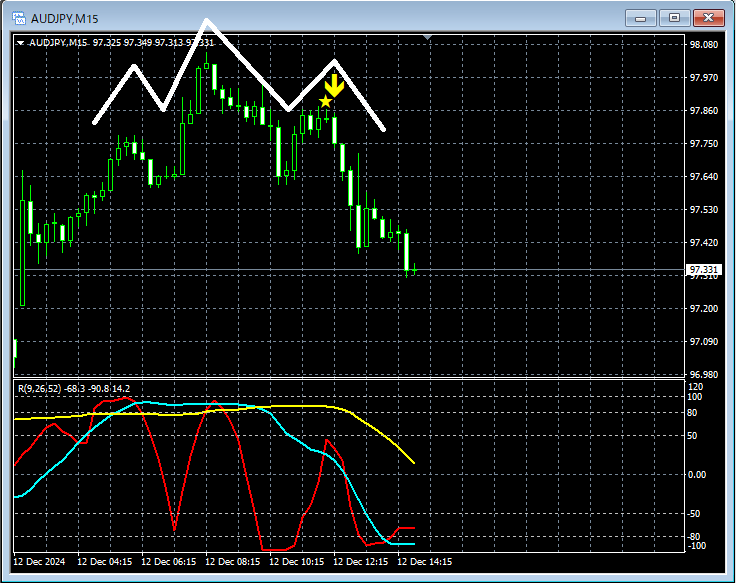上の5分足では、mBDSR(RCI2本フィルター)の戻り売りサインが点灯し、その後、プライスは順調に下げている。結果として三尊(ヘッドアンドショルダー)の右肩でmBDSR(RCI2本フィルター)のサインが点灯して下げている形となっている。