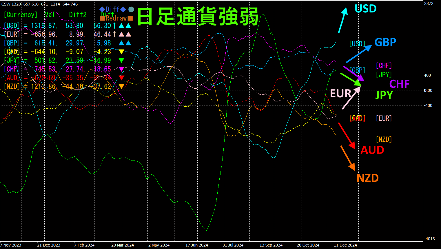 USD、EUR、GBPが上向きです。一方、NZD、AUD、CHF、JPY、CADが下向きになっています。日足通貨強弱チャートでは、USDの著しい上昇とNZDの下落が目立っています。