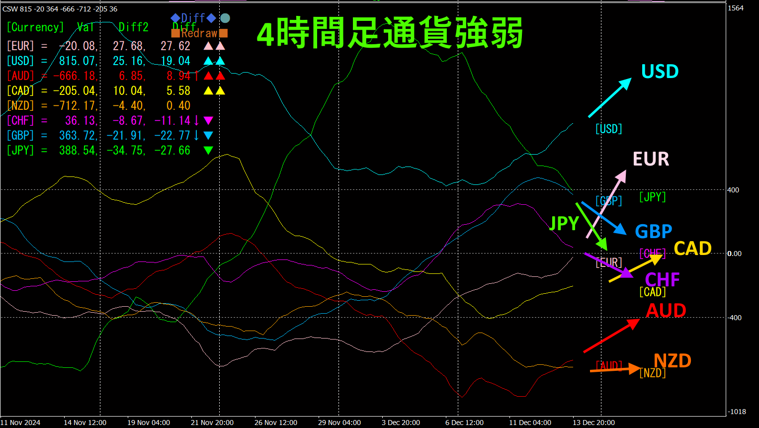 4時間足では、EUR、USD、AUD、CADが上向き、JPY、GBP、CHFが下向き、NZDは水平になっています。