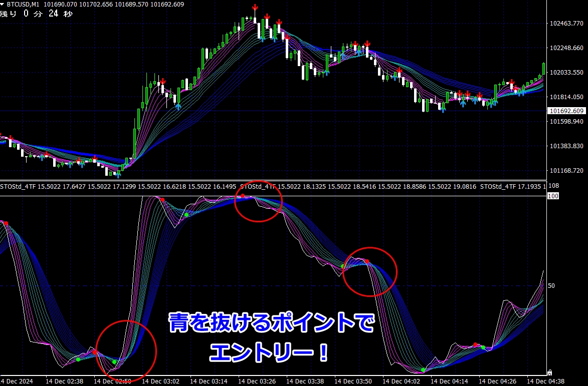 ② 矢印サイン点灯状態で、インジケーターのピンク色の帯が、緑の帯を下からすくい上げるような形状であれば、現在のローソク足が確定する数秒前か確定の直後に1分判定または3分判定でハイエントリーします。
