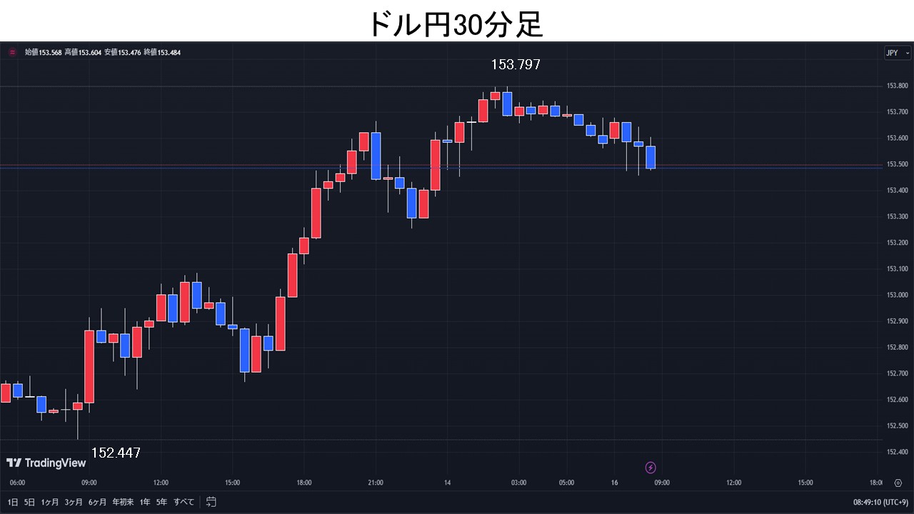 ドル円、日銀の利上げ見送りとの観測報道で153円台後半へ上昇。