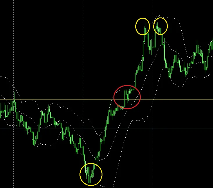 一例として、黄色〇の様な場面で「適当な逆張り」や、赤〇の様な直近ブレイクでエントリーなどが出来ます。
