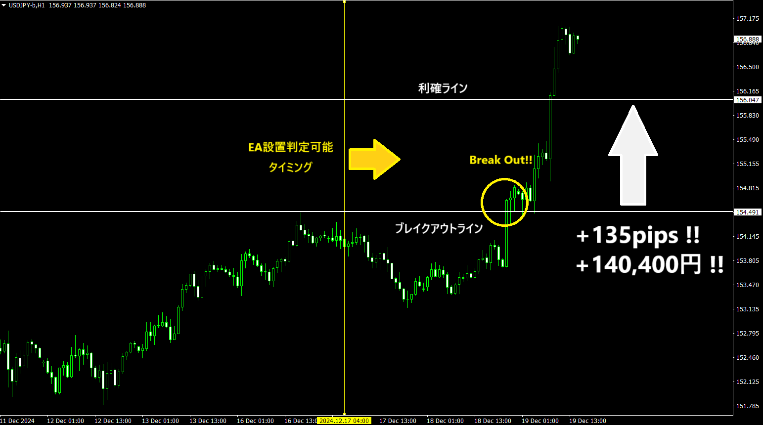 ④12/18 21:00(日本時間04:00)ブレイクアウト発生、EAにより自動エントリー