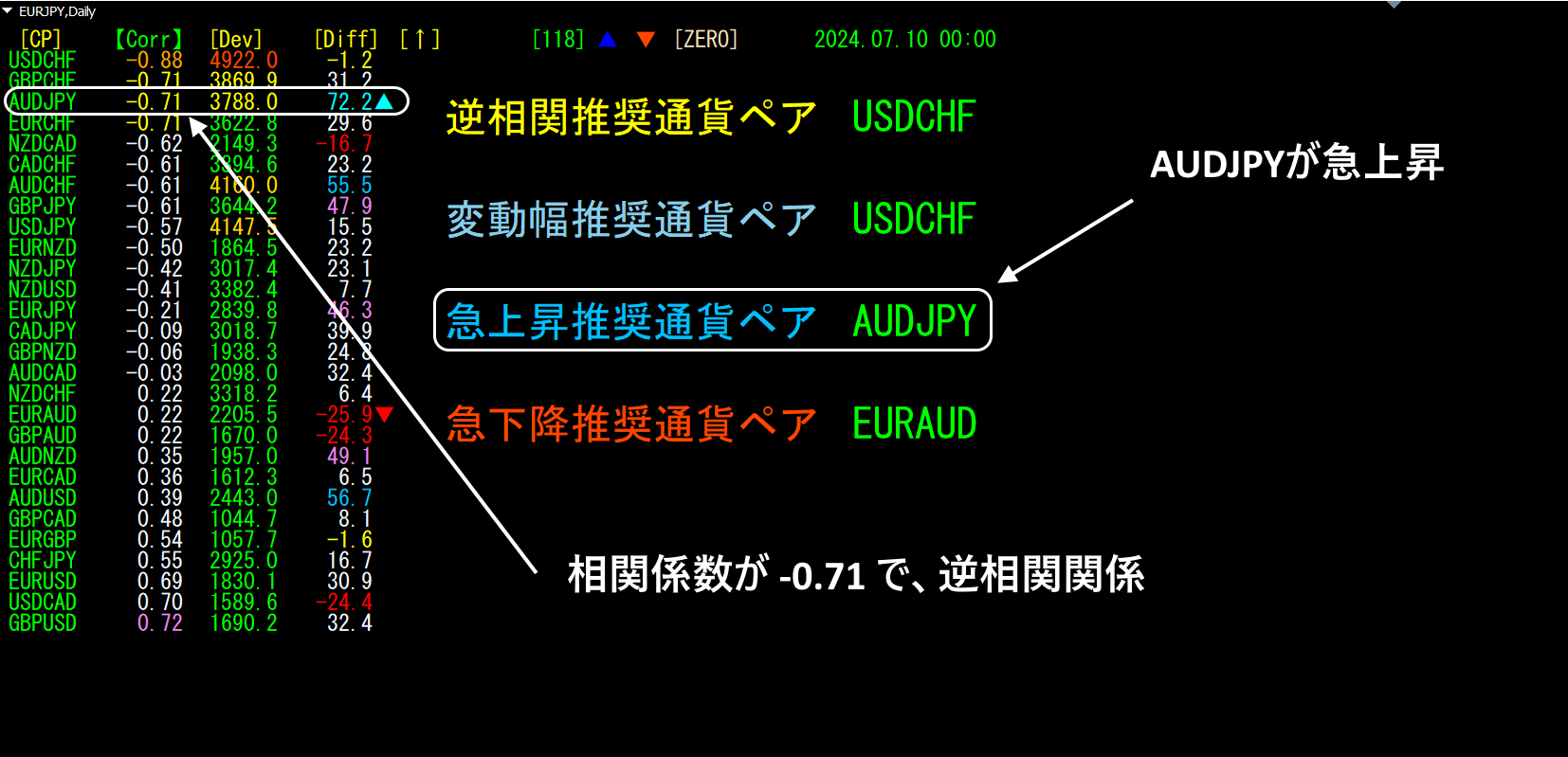 日付を2024年7月10日に遡って、「究極の逆相関インジケータ」を使ってみたものです。