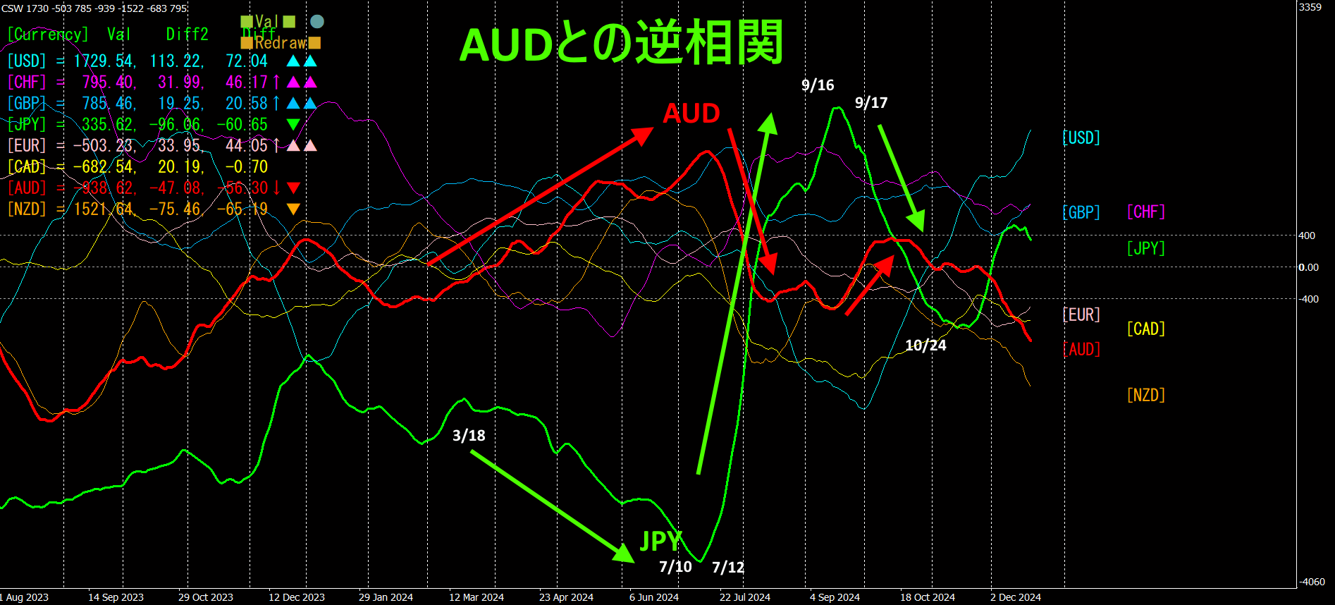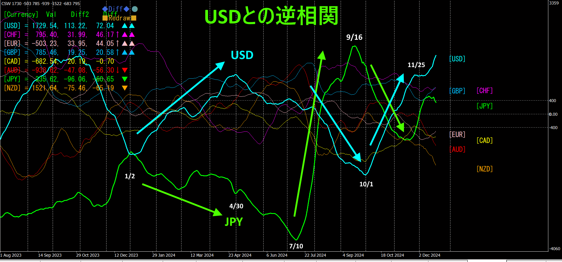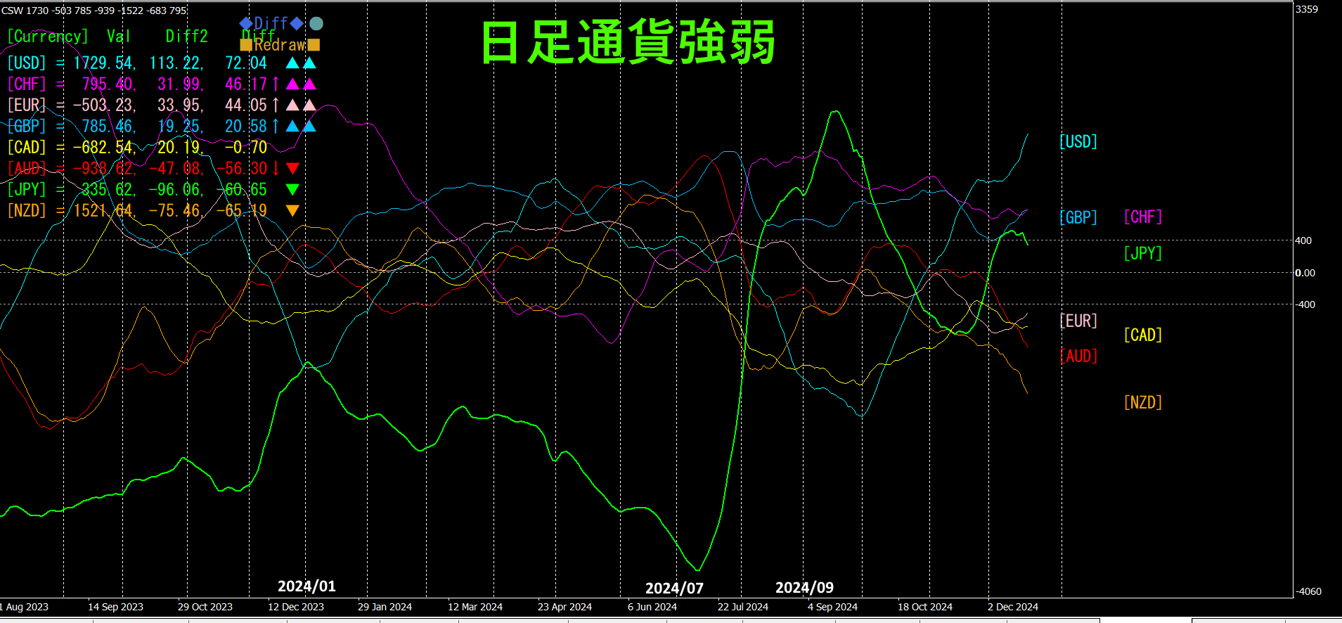 他の通貨に比べて、JPYが大きく上下に波打っているのが分かります。2024年1月から7月に掛けて、通貨JPYが単独で弱くなり、その反動からか、7月から9月に、大底から最も強い通貨に躍り出るなど、異常とも言える挙動を示しました。