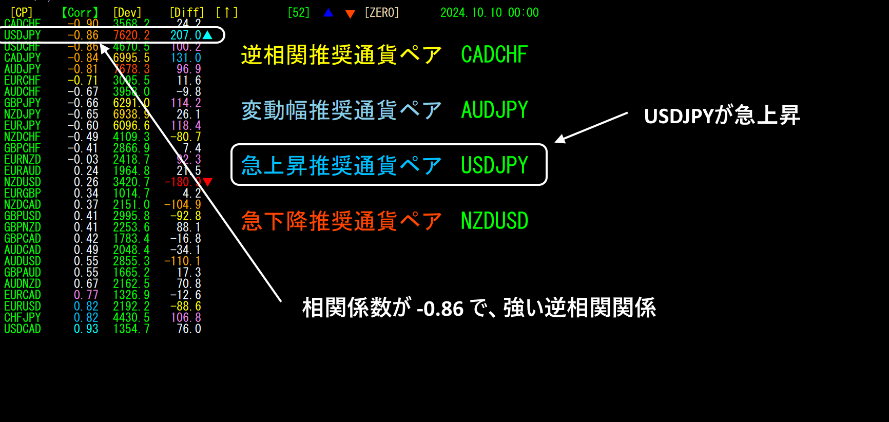 同様に、日付を2024年10月10日に遡って、「究極の逆相関インジケータ」を使ってみたものです。