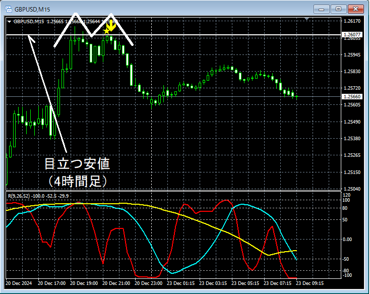 また、この例では、損切りラインを直近高値(ダブルトップの左側の山)の少し上に置くことなどにより、リスクリワードの良いトレードが可能である。