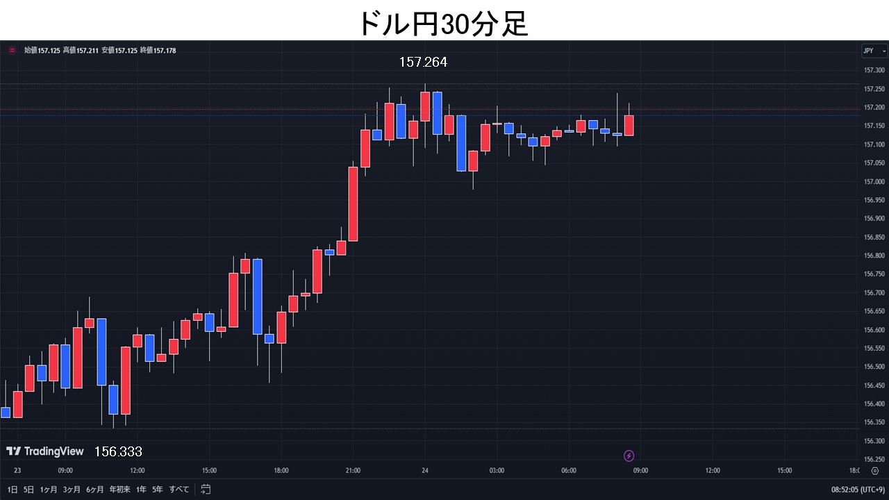 東京時間、ドル円は、ポジション調整で156.33円まで下押しとなるが、日経平均の堅調推移を受け156.60円まで買い戻された。欧州時間、ドル円はジリ高。NY時間、米利下げペースが鈍化するとの観測を背景に、米10年債利回りが4.59%台まで上昇すると、ドル円は157.26円まで上昇。