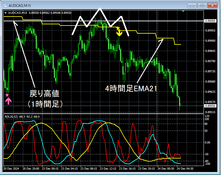 上位足の状況は省略。上の15分足では、1時間足レベルの戻り高値やこのケースで重要視している4時間足EMA21を明確に上抜けすることができずに三尊を形成して反落。結果として三尊の右肩でmBDSR(RCI2本フィルター)の戻り売りサインが点灯するパターンとなっている。