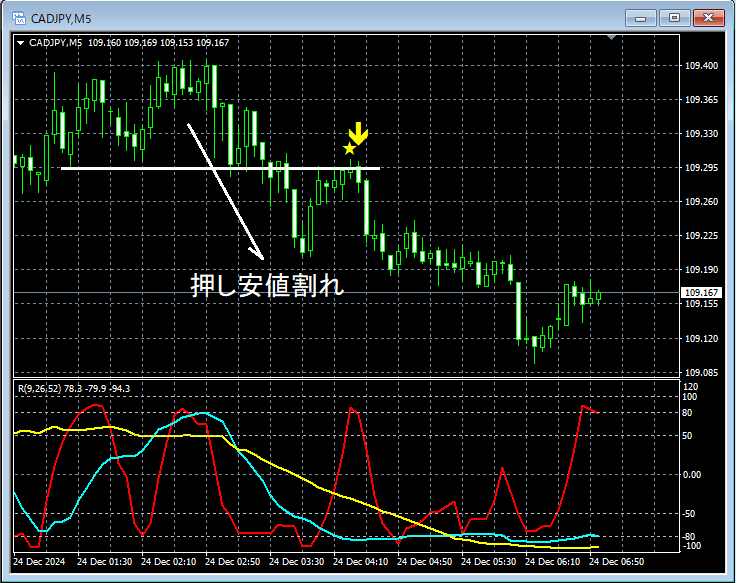 上位足の状況は省略。上の5分足では、押し安値を下抜けした(上昇トレンドがいったん否定された)後の上昇でmBDSR(RCI2本フィルター)の戻り売りサインが点灯し、その後、プライスはしっかり下げている。