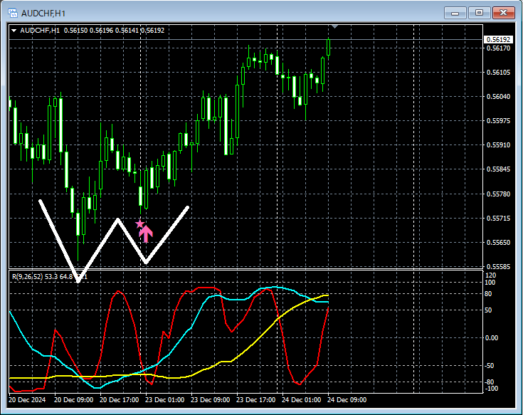 上位足の状況は省略。上の1時間足では、ダブルボトムの右側の谷でmBDSR(RCI2本フィルター)の押し目買いサインが点灯するパターン。サイン点灯後、プライスは順調に上昇している。