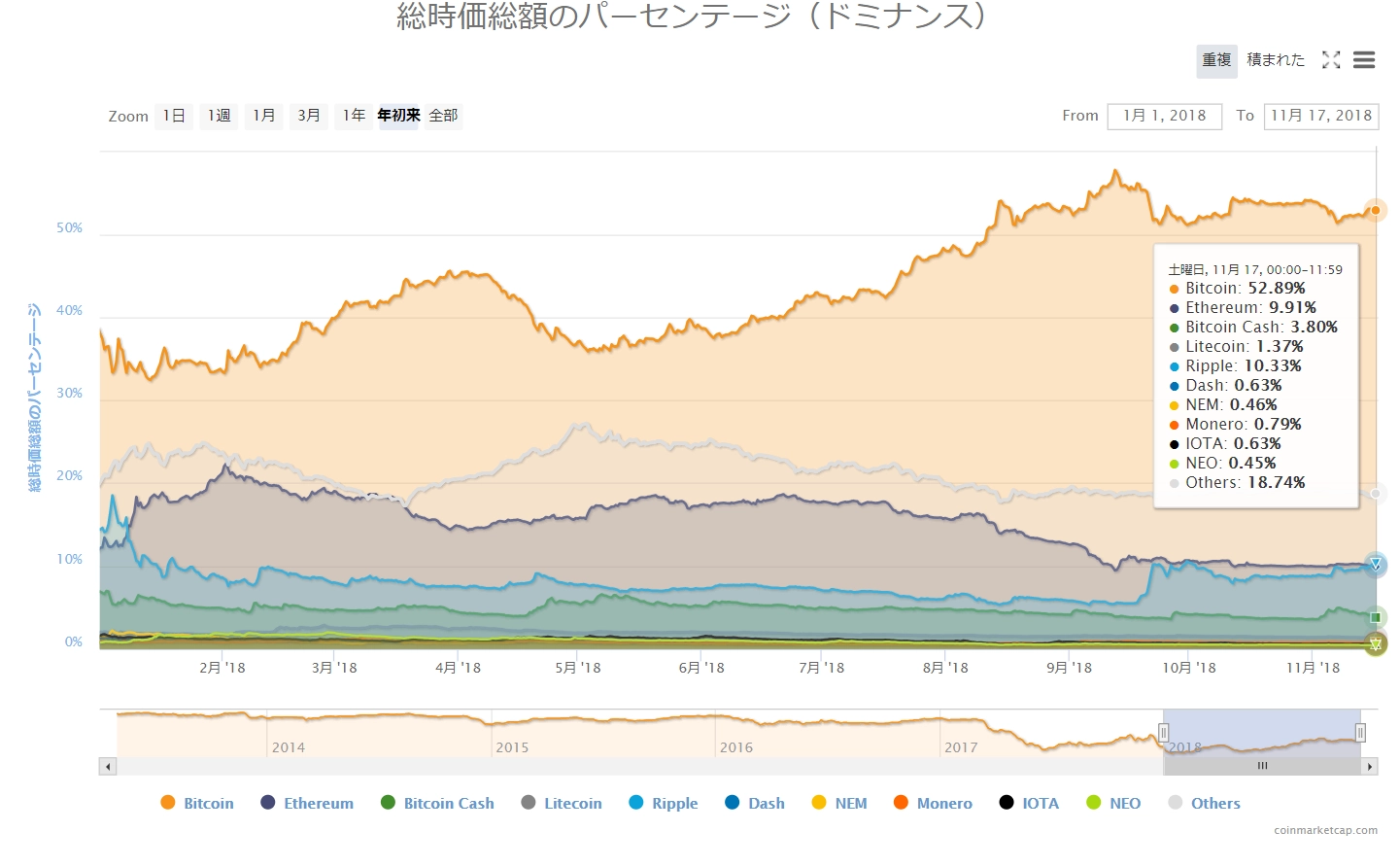 画像は2018年11月17日のキャプチャ。一昨日の暴落から一転して、半数の銘柄がプラスに戻した昨日でしたが、それとは打って変わって再度全面的に「赤」に染まっています。ビットコインキャッシュが約8%と大ダメージ。ビットコインなどの主要銘柄は、1~3%の下落となっています。