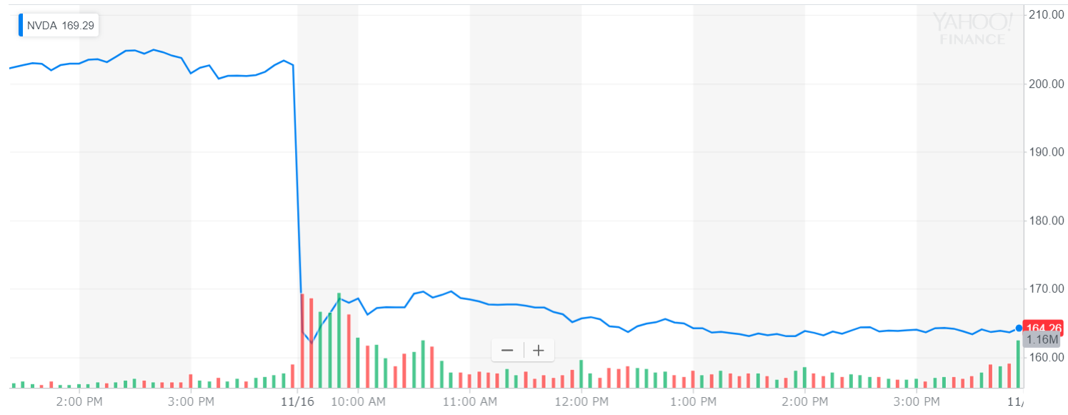 主力のゲーム部門が予想よりも弱かったほか、仮想通貨ブームの後退でマイニング用チップの販売が予想以上に不調で在庫が積み上がっているようです。