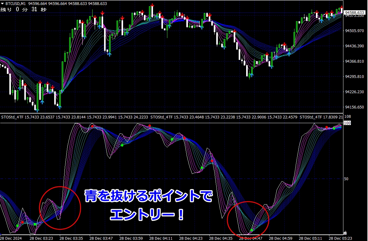 ② 矢印サイン点灯状態で、インジケーターのピンク色の帯が、緑の帯を下からすくい上げるような形状であれば、現在のローソク足が確定する数秒前か確定の直後に1分判定または3分判定でハイエントリーします。