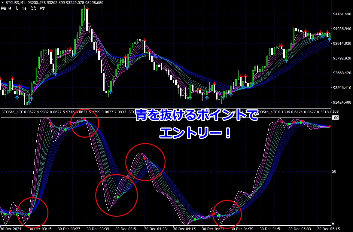 ② 矢印サイン点灯状態で、インジケーターのピンク色の帯が、緑の帯を下からすくい上げるような形状であれば、現在のローソク足が確定する数秒前か確定の直後に1分判定または3分判定でハイエントリーします。