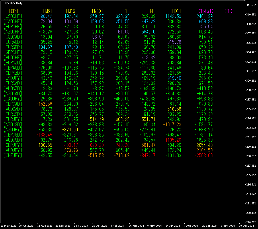 [Total]数値の降順に並んでいます。一番上にあるUSDCHFは、[H4]を除く全ての時間足で青色系の表示色になっています。Total数値が 2401.39と、プラスの数字になっています。USDCHFに上昇トレンドが発生していることが示唆されます。