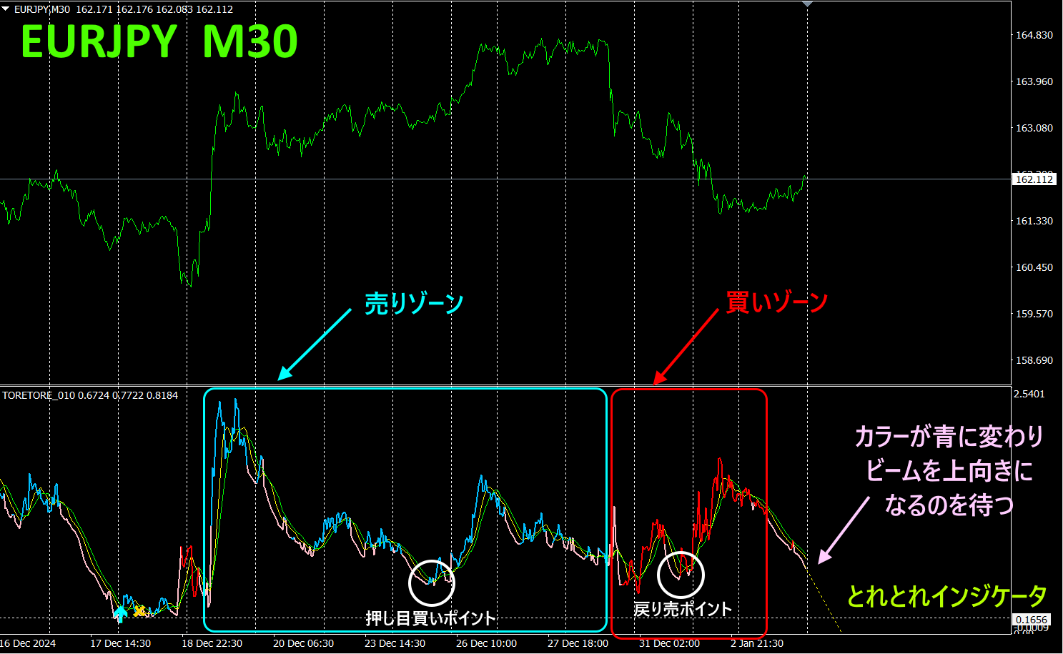 「とれとれインジケータ」は、様々な所で活用できる汎用インジケータになっています。以下は、「とれとれインジケータ」の適用事例です。通貨ペアはEURJPYでチャートは30分足です。