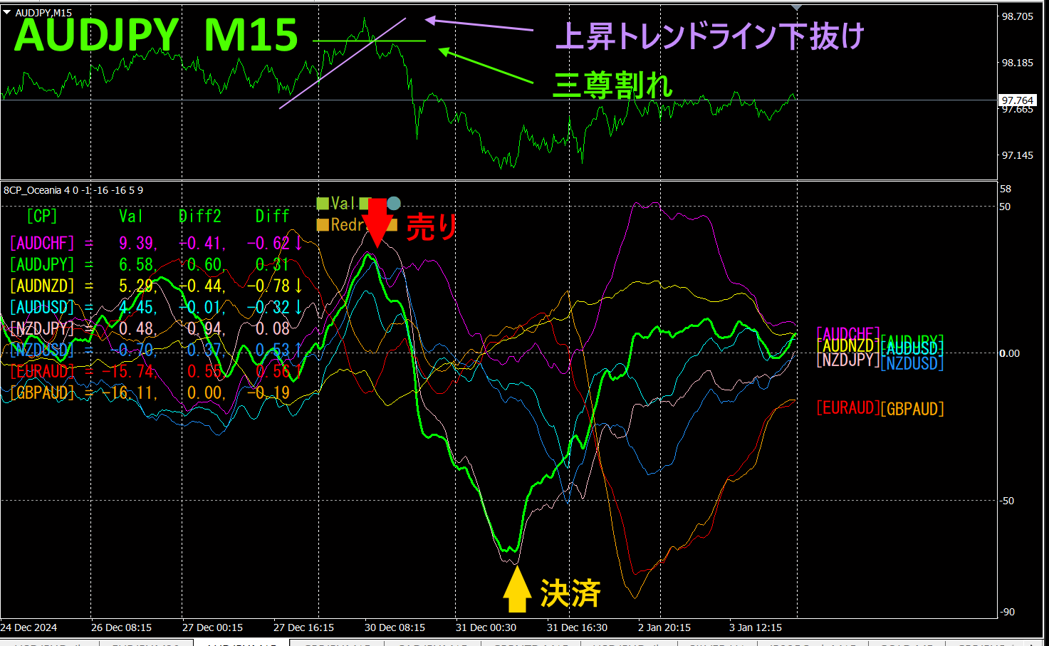 上半分は、AUDJPYの15分足チャートです。下半分は、「8CP見える化インジータ」によるものです、緑色太線のグラフがAUDJPYに相当します。